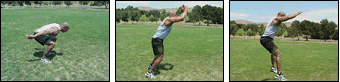 Beginning in a squat position, and using arms and legs, jump vertically and horizontally forward, maximizing both height and distance. Land with knees slightly bent, return to squat position, and repeat movement.