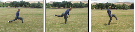 In a standing position with hands on hips or to side, reach forward, as far as possible, with right (left) leg into a lunging position. At extended position, front (reach) leg should be at a 90-degree angle to ground with quadricep (thigh) parallel to ground. Raise left (right) back leg up, with a slight bend, as high as possible toward sky. After reaching back leg as high as possible, swing it forward, still slightly bent to as high a position as possible to the front. Lower new front leg to lunging position and repeat movement.