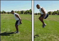 Note: To prevent knee injuries, be sure to land with the knees slightly bent. To improve explosive power, be sure to spend as little time on the ground in-between jumps as possible.