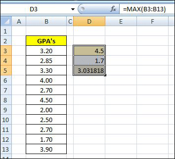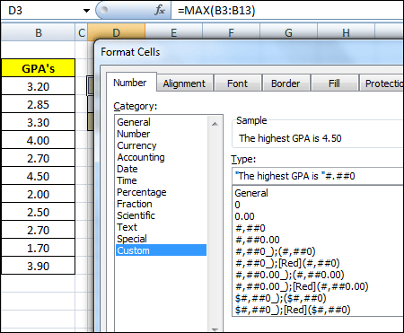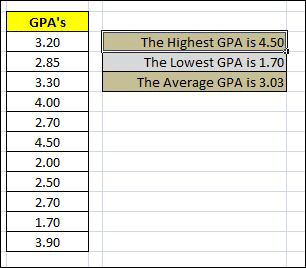 Do you ever want to include additional information inside of a cell that contains or calculates a number? Here’s how. Let’s pretend you have a classroom of students. You have a list of their Semester Grade Point Averages and want to quickly summarize the class, looking at the highest, lowest, and average.