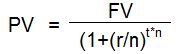 To solve for the present value, we use good old Algebra to flip our earlier formula.   Now with FV as the cash inflow expected in the future, r as the annual rate of interest (typically the rate the lender feels he could earn elsewhere), t as the total number of years before the cash flow is realized, and n as the number of times the interest is compounded per year, the Present Value, PV, is: