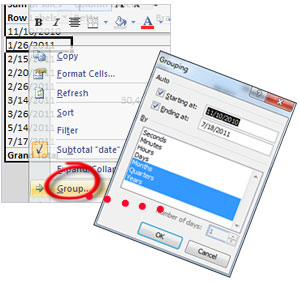 Using just the basic elements of Pivot Tables, one can easily produce a table showing the total sales for each date and each salesperson. (See Illustration). But having data laid out in this manner is not completely helpful. A better way to group the information might be by year, quarter, or month. Or all three. There are, of course, many ways to add those levels of grouping when producing this pivot table. Those new to Pivot Tables might add columns to the raw data, converting the date to columns for the month (using the month() function), year (using the year() function), and quarter (applying the roundup() function to a simple equation: monthNumber/3- see :What Quarter is It?). Even adding one for the week wouldn’t be that difficult.