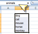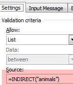 You can simplify things by applying a few simple techniques. While the “Source” box on the data validation window doesn’t allow a range outside of the current worksheet, it does allow named ranges, which can refer to these external ranges. To do so, however, requires the use of the Indirect Function, which will treat anything you feed it as if you’d typed it directly. While typing “animals” into the “Source” box will create a drop down list of one value- “animals”, for example, using Indirect(“animals”) will create a drop down box with the values of the named range called “animals.”